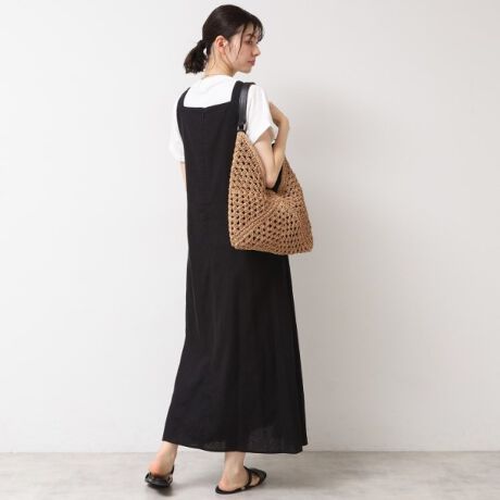 テントラインのジャンパースカートです。スクエアの襟ぐりはすっきりと洗練された印象です。