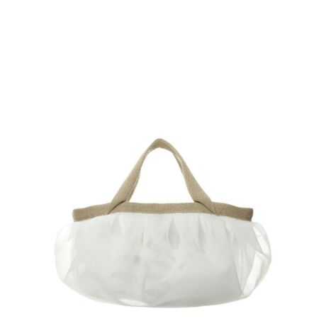 工業用のポリエステル素材にプリントを施し、イタリア製の麻テープを組み合わせました。