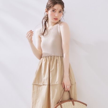 ストレッチ性のあるリブニットと程よいハリ感のある布帛素材をドッキングしたデザインワンピース。