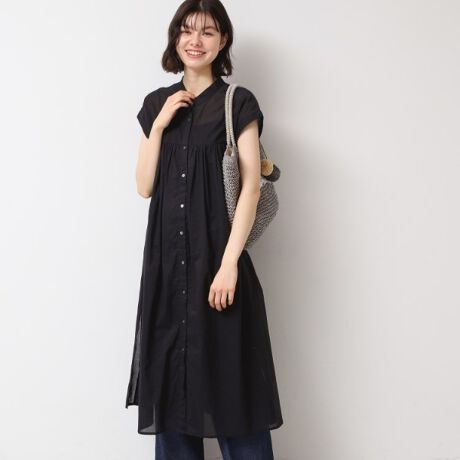ギャザーをたっぷりと入れたバンドカラーデザインのワンピース。