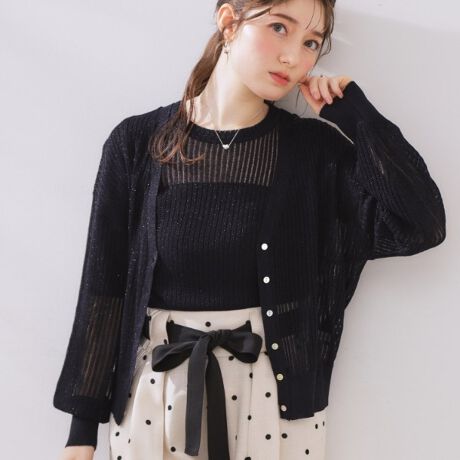 上品なラメが入った糸を透かしリブ編みした、サマーニットカーディガン。