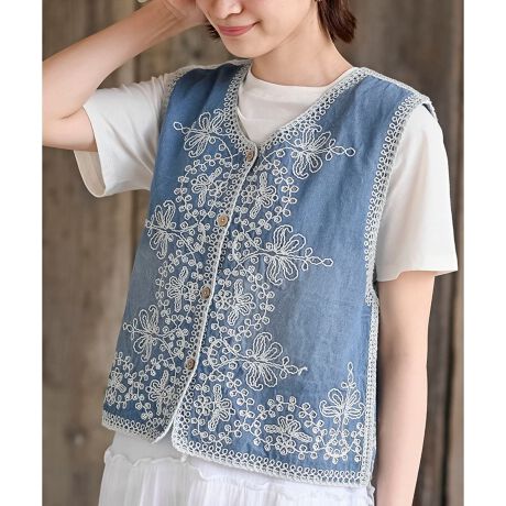 贅沢な刺繍をあしらったアンティーク調のデニムベスト
