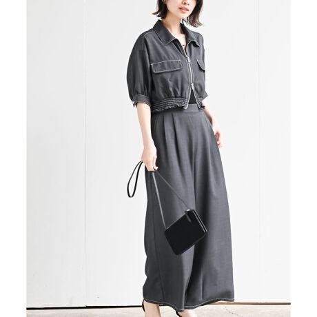 ショート丈でコンパクトなジャケットとワイドシルエットのパンツがバランスの良い1枚です。