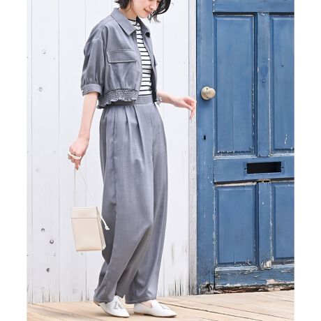 ショート丈でコンパクトなジャケットとワイドシルエットのパンツがバランスの良い1枚です。
