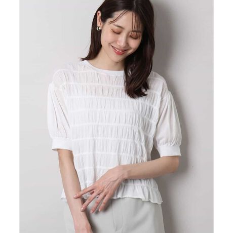 ややシアー感のある薄手素材が涼しげな印象のサマーニット。シャーリングデザインがすっきり見えを叶えながら体のラインを拾いすぎず着こなしやすいシルエットが嬉しい。甘くなりすぎないドロップショルダーデザインで仕上げました。