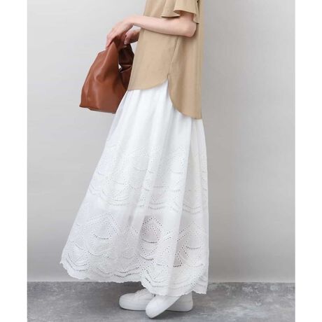 ナチュラルなコットン素材に甘すぎない刺繍が施されており、涼しげで着映えするロングスカート。ウエストは総ゴム仕様で、紐でサイズ調整ができるデザイン。しっかりとしたレングスがあり高身長の方に特にオススメです!