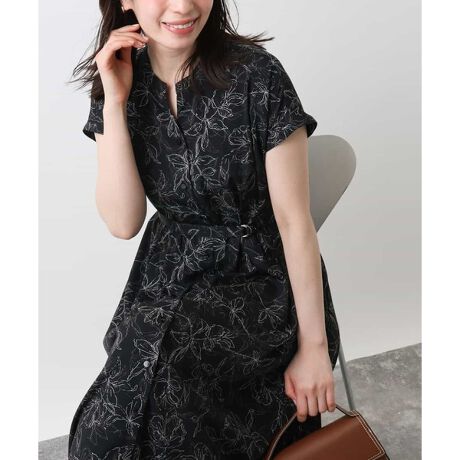 落ち着いたラインフラワー柄が大人っぽいワンピース。バンドカラーがすっきりとしたネックラインできれいにに見せてくれます。袖口が折り返しデザインで、腕周りもすっきりとした印象に仕上げました。