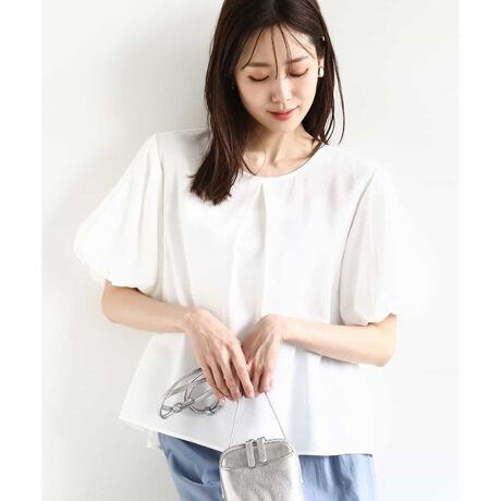 ふんわりとしたバルーン袖がポイントのブラウス。衿元はやや広めのクルーネックで、女性らしくデコルテをきれいに見せてくれます。