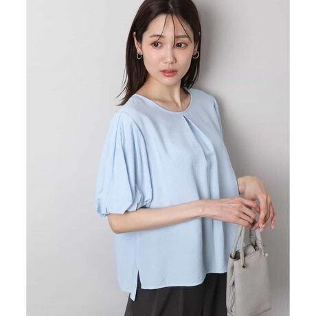 ふんわりとしたバルーン袖がポイントのブラウス。衿元はやや広めのクルーネックで、女性らしくデコルテをきれいに見せてくれます。