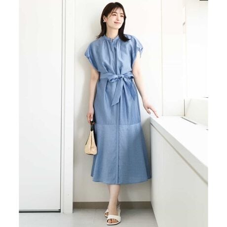 ストライプを切り替えたデザインが新鮮なワンピース。ボリュームのある袖デザインですが、短めの袖丈ですっきりと着こなせます。ウエストのリボンを外せばまた雰囲気を変えた着こなしに。前開きタイプのようなデザインですが、釦は上部のみとなり、スカート部分の隙間からインナーが覗く心配もありません。