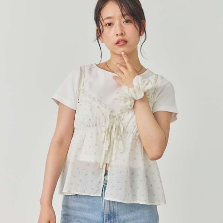 ふんわり感が可愛い花柄キャミソールとチビT、さらにキャミと同柄のシュシュがセットになったアイテム。