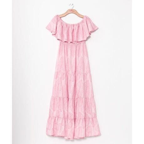 [型番:YCO-5103-2025]エレガントな胸元フリルが印象的なティアードワンピース。裾に向ってボリュームアップするシルエットはスタイルアップにも効果的。襟周りはゴム仕様でオンショルダー、オフショルダー2wayの着こなしがお楽しみいただけます。リゾートウェアからブライズメイドやフラステージのチームドレスとしてもおすすめです。線画のバナナリーフと大胆なアンスリウムのシンプルで愛着がわく2柄のラインナップ。