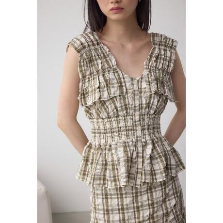 ■チェックシャーリングペプラムブラウス■ポイントオリジナルのチェック柄を施したペプラムブラウスになります。■ディティール肩回りにたっぷりと入れたシャーリングやフリルデザインがポイント。ボリューム感のあるフリルデザインが肩まわりを華奢に見せてくれます。ウエストのシャーリングデザインでメリハリが出て、スタイルアップ効果抜群です。■スタイリング同素材の250ISC31-310E タックドレープチェックスカートとセットアップで着ていただけます。やや甘めのデザインなので、ヴィンテージ加工のデニムやカーゴパンツなど、トレンド感のあるカジュアルなアイテムとの合わせがおすすめです。■生地オリジナルチェック柄をカチオン染め分けすることでポコポコした表面感になっています。透け感:なし裏 地:なし伸縮性:なし光沢感:なし[注意事項]※画像の商品はサンプルです。実際の商品と仕様、加工が若干異なる場合があります。※画像の商品は光の照射や角度、お使いのモニター環境により、実物と色味が異なる場合がございます。※着用、お取り扱いの際は、アテンションタグをご確認ください。