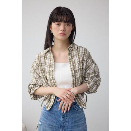 ■ラウンドヘムドロストシャツ■ポイント裾に施したドロストでシルエットの変化を楽しめる1着。■ディティール裾に施したドロストでシルエットの変化を楽しめ、ドロストを絞ると丸みのあるスタイルで着用頂けます。トップスとしてはもちろん、羽織としても活躍します。無地1色と、チェック柄2色のカラーバリエーションです。■スタイリング裾ドロストを絞っていただき、ハイウエストボトムと穿くとスタイルアップが叶います。■生地オリジナルチェック柄をカチオン染め分けすることでポコポコした表面感になっています。透け感:なし裏 地:あり伸縮性:なし光沢感:なし[注意事項]※画像の商品はサンプルです。実際の商品と仕様、加工が若干異なる場合があります。※画像の商品は光の照射や角度、お使いのモニター環境により、実物と色味が異なる場合がございます。※着用、お取り扱いの際は、アテンションタグをご確認ください。