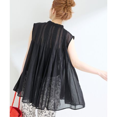 透け感が涼しげな印象で、黒は無地、ブルーとホワイトはストライプ柄を効かせており、フロント釦は比翼仕立てでフラットに仕上げた大人な雰囲気あるブラウスです。