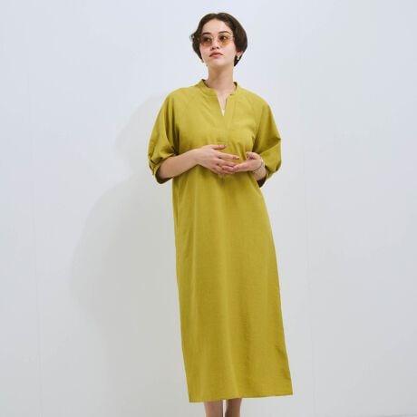 程よく深さのあるキーネックデザインが涼し気な印象に仕上げるワンピースは