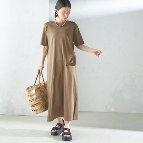 すとんと落ちるAラインシルエットが身体のラインを拾いにくく、こなれ感を演出するロング丈のワンピース。