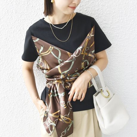 今年らしいレイヤードスタイルが叶う、スカーフ×Tシャツ。