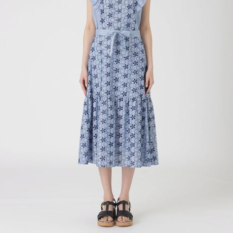 [型番:55S13543__]◆花柄のアイレット刺しゅうが涼しげなスカート【Design】花柄とドットをあしらったオリジナルの刺しゅうレース素材を使用したスカートです。軽やかな生地感でカットソーなどのカジュアルアイテムとのコーディネートもバランスよくきまるのが魅力です。【Styling】シャンブレーレースブラウス(55M12543)とのコーディネートがおすすめです。
