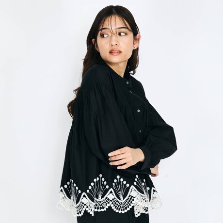 スカラップ刺繍ヘムデザインのインド綿を使用したバンドカラーブラウスです。