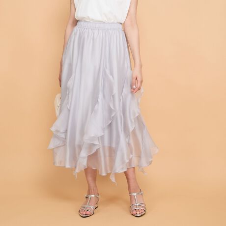 マーメイドをイメージさせる、縦に流れ落ちるようなラッフルフリルデザインで動くたびに揺らめくシア―スカートはこれだけで華やぎのある1枚です。
