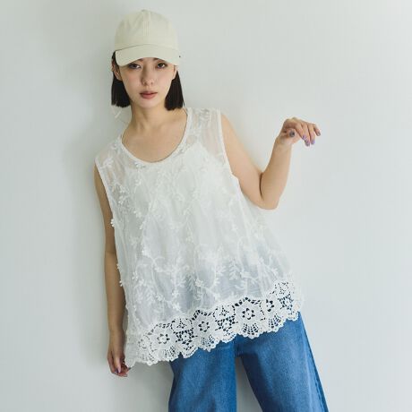 裾には中花レースをあしらったノースリーブトップスです。