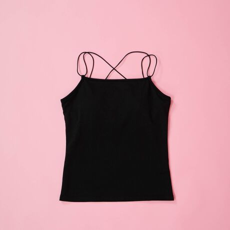 ダブルバッククロスのナローストラップデザインのカップ付きキャミソールは使い勝手の良いオフホワイトとブラックの2色展開です。