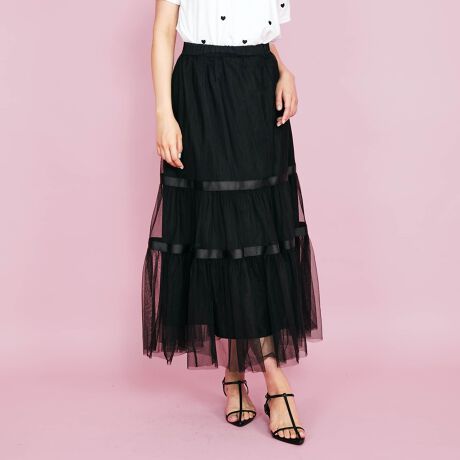 表地のチュール素材に2段のサテンテープを施したフレアラインのティアードスカートは、トレンドのバレエコアなスタイルにおすすめです。