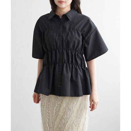 たっぷりとギャザーを寄せたシャーリングデザインが映えるシャツ。