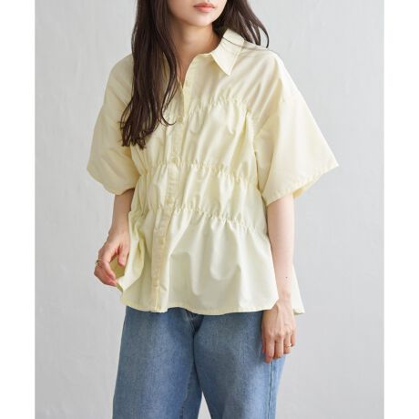 たっぷりとギャザーを寄せたシャーリングデザインが映えるシャツ。