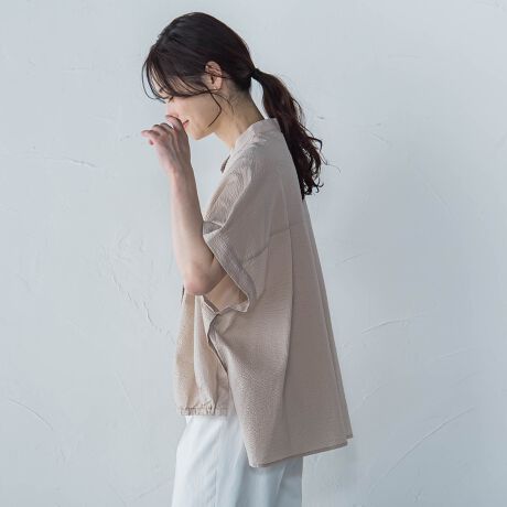 軽やかな素材で涼しく着られる、バンドカラーブラウス。