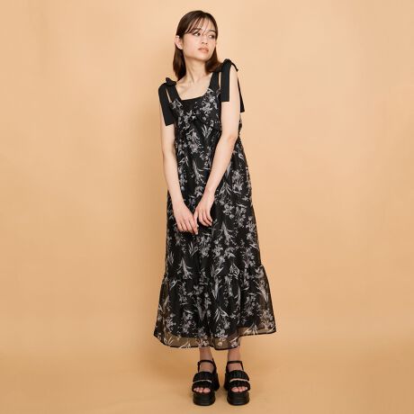 ストラップショルダー部分がワイドリボンデザイン、バスト下にフリルをあしらったフラワー柄ワンピース。