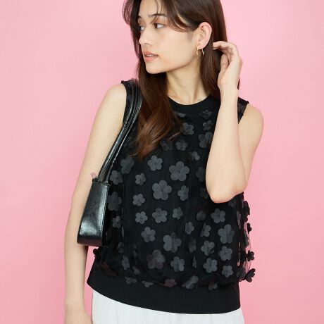 シアーメッシュ地に大きさの異なる3Dフラワーモチーフをあしらったレイヤード風トップスは一枚で主役級のトップスです。