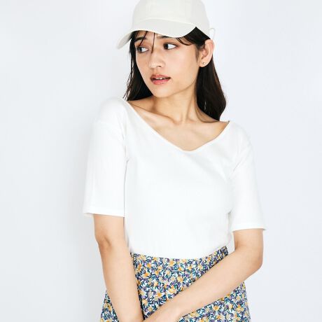 コットンタッチのテレコ素材を使用した前後2WAYでボートネック見えとVネック見えでのご着用が可能な五分袖カットソーです。