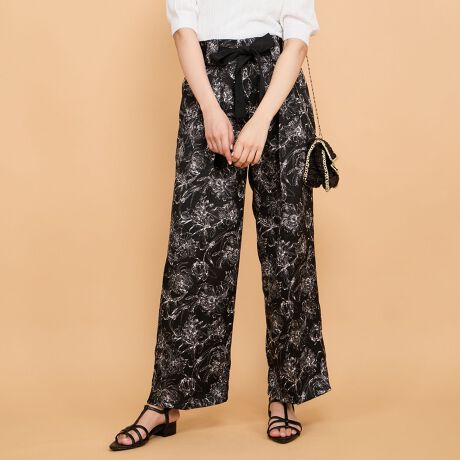 太さの異なる糸を組み合わせて織り上げた立体感のあるブッチャー素材を使用し、線描きで表現されたフラワー柄プリントを施したウエストリボンデザインのセンタープレスパンツです。
