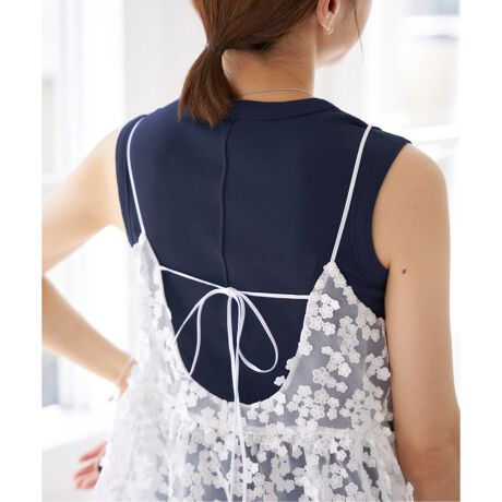 アームホールを深く切り落とし、背中の縫い目をカットオフにした、クルーネックタンクトップ。