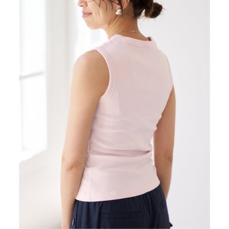 アームホールを深く切り落とし、背中の縫い目をカットオフにした、クルーネックタンクトップ。