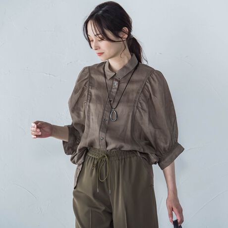 ほんのり透け感のあるふんわり袖と、肩に入れたギャザーがやわらかな女性らしさを引き立てるブラウス。