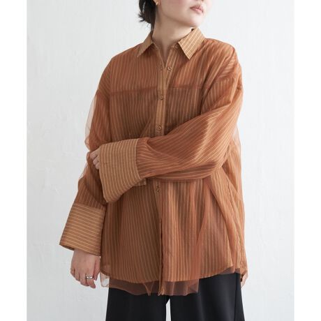 繊細な透け感が魅力のシアーストライプシャツに、ふんわりとチュールを重ねた印象的な一枚。