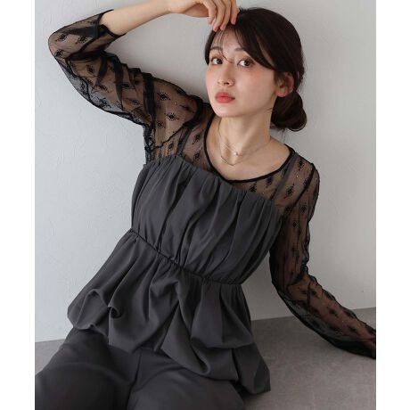 柄入りのシアーレーストップスは、繊細な透け感と上品な印象を兼ね備え、手持ちのアイテムにレイヤードするだけでスタイリングを格上げしてくれます。