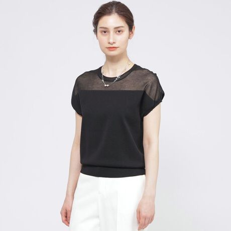 <シアー切替えがアクセントのデザインニットプルオーバー>