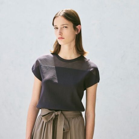 <シアー切替えがアクセントのデザインニットプルオーバー>