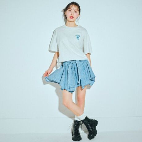 シャツを巻いているようなデザインが特徴のデニムキュロットです。