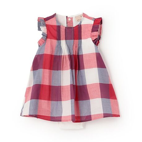 幅広のマドラスチェック柄で仕上げたワンピース風ロンパースです。