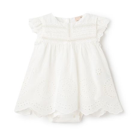 レースをさまざまな技法であしらったワンピース風のロンパースです。