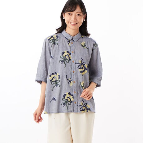 綿麻シャンブレースモールブーケット総刺繍シャツブラウス