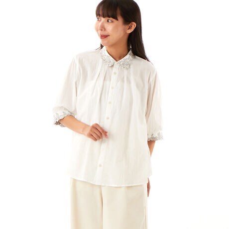 [型番:34151052]適度な厚みのコットンローンワッシャー生地を使用したシャツブラウス。ネックラインに寄せたタックと小さく膨らむパフスリーブで女性らしい雰囲気に仕上げました。衿とカフスにお花の縁取り刺繍が入った、フェミニンで可愛い1着です。お手入れ:手洗い店舗へお問い合わせの際は、下記の品番をお申し付け下さい。[品番:34151052]
