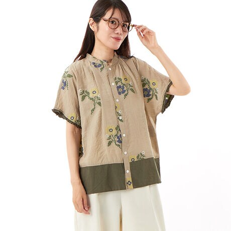 ツインになった花のモチーフをクロスステッチ風に織り上げた、国内生産のオリジナルジャカードブラウス。