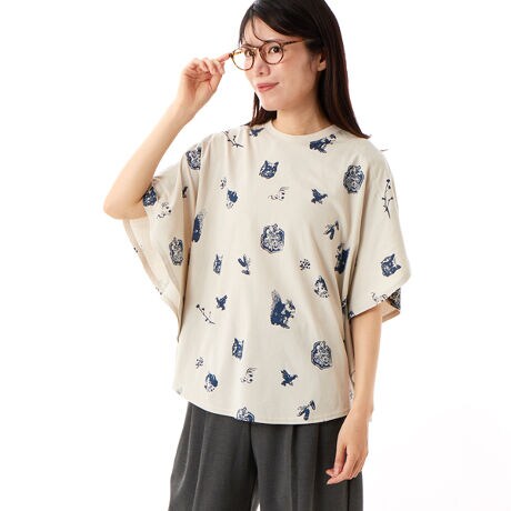 庄島歩音さんの描くネコやリス、鳥などのモチーフを基に柄を構築し、単色の総柄プリントに落とし込んだデザイン性の高い1枚に仕上がっています。