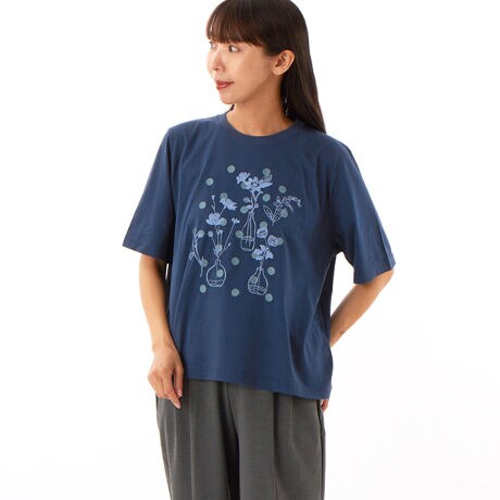 ドットと初夏の花々を花瓶に飾った刺繍が、涼しげな印象を与えてくれます。